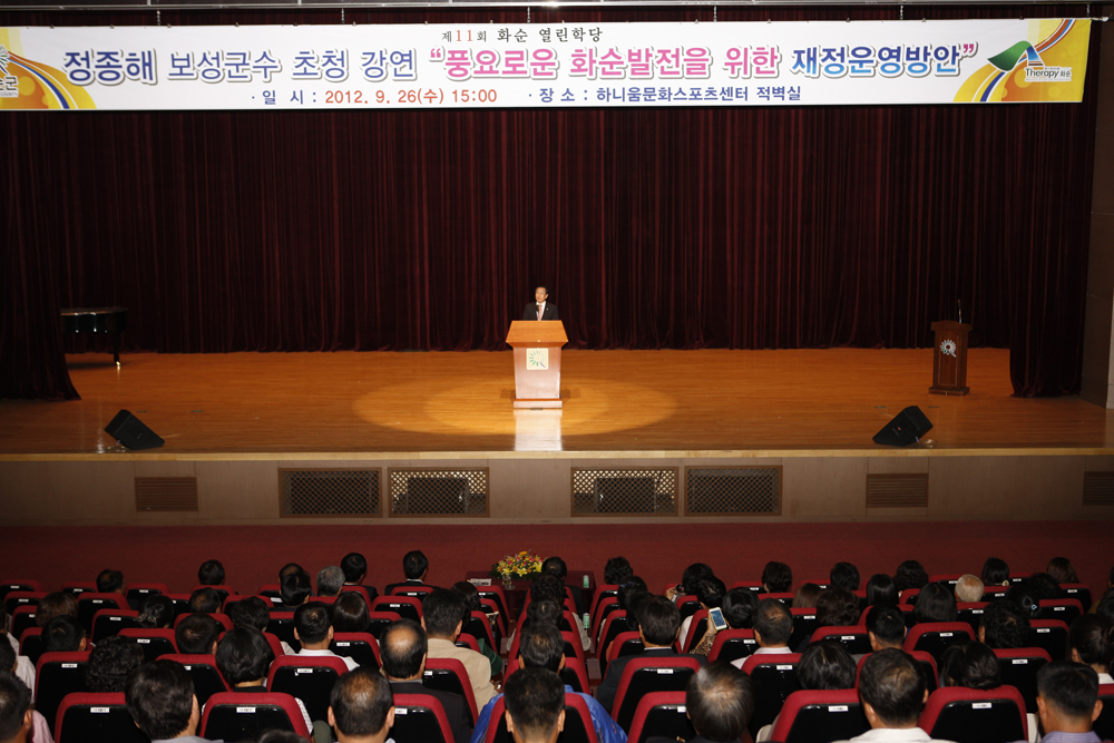 정종해 보성군수가 지난 26일 화순군 하니움문화스포츠센터에서 열린 제11회 화순열린학당의 강사로 초청되어 “풍요로운 화순 발전을 위한 재정 운용 방안”이란 주제로 강연을 했다. 이날 정 군수는 홍이식 화순군수를 비롯한 1,000여 명의 화순군민과 공무원 등이 참석한 가운데 지방 재정 운용의 효율적 운영 방향과 지방자치 발전을 위한 ..