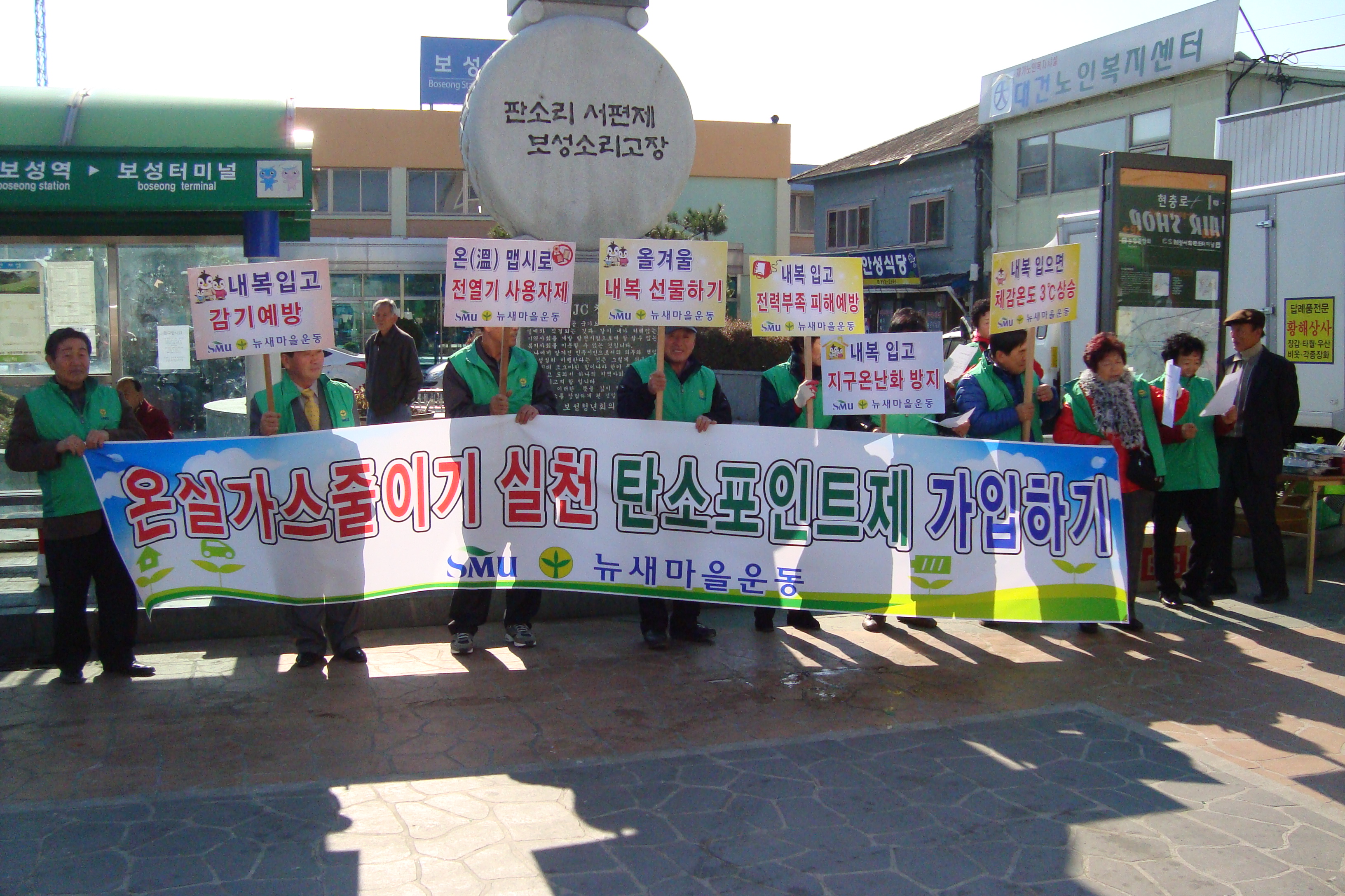 탄소 포인트제 가입 및 내복 입기 추진 새마을운동보성군지회(회장 이동현)에서는 지난 25일 보성역 앞에서 남․여 지도자 30여명이 참여한 가운데 온실가스 줄이기 실천 운동 캠페인과 겨울철 전력예방을 위한 내복 입기 캠페인을 실시했다. 특히 회원과 주민의 동참을 유도하기 위해 탄소포인트제 가입신청서 작성자에게 주사위를 던져 내의, 양말 등 ..